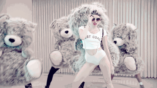 In June 2013, Miley releases a music video for the song “we can’t stop” which is a very unusual video which is bringing out the new image of herself. We see Miley appear in tight fitting costume which is sexualising her of to her audience however at 1 point we see her dancing with giant tedy bares and wearing one of them on her back.